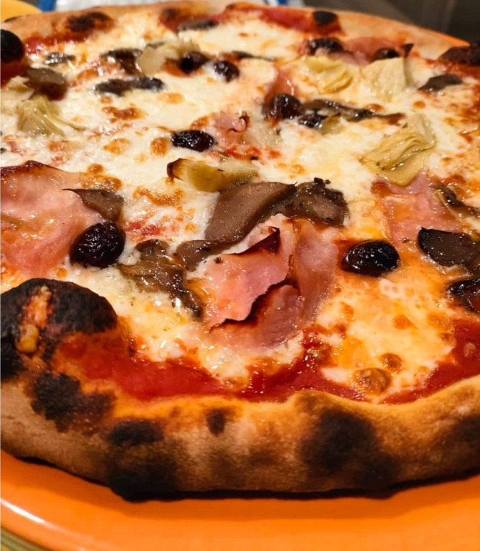 Pomodoro italiano, fiordilatte, funghi trifolati, carciofini, prosciutto cotto, olive
